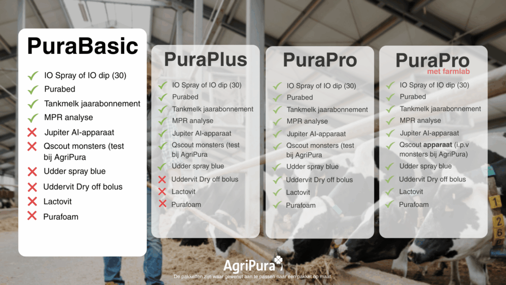 Via slimme metingen, hoogwaardige producten en praktische kennis helpen we jou om grip te krijgen op de prestaties van je veestapel. Start vandaag met het PuraBasic pakket en zorg voor een hogere melkproductie, minder melkverlies en een betere diergezondheid.
